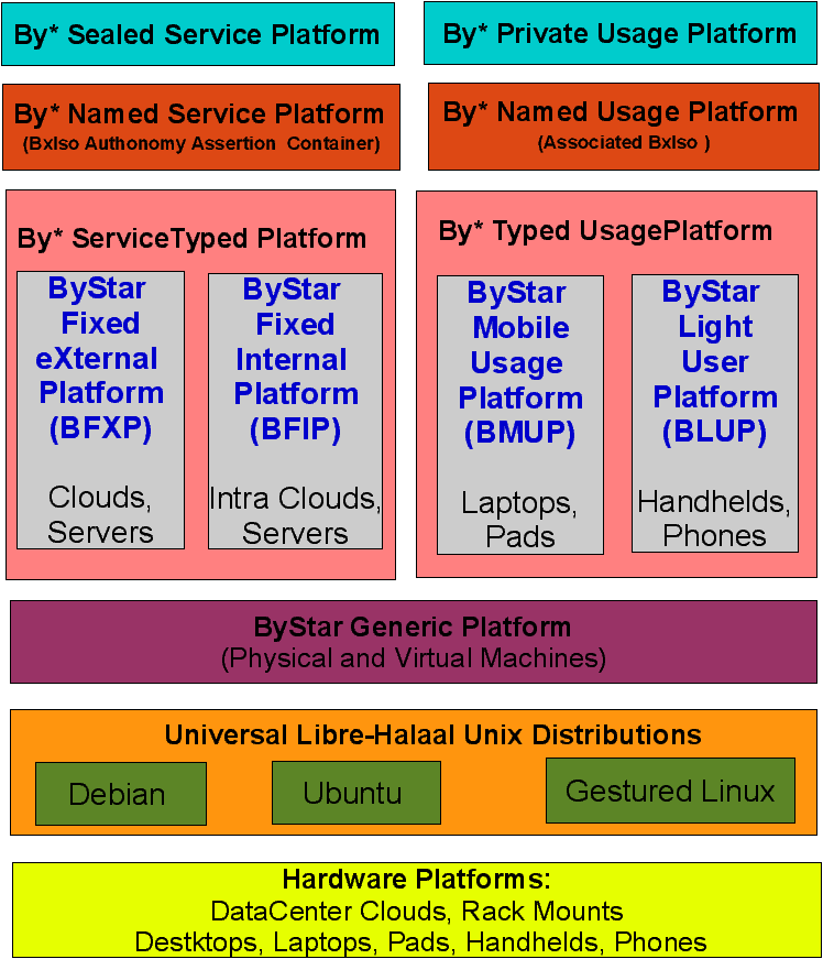 Universality of BISOS is inherited from being based on the Debian GNU/Linux. This universality permits all ByStarPaltfroms (BxP), be it handsets, devices, server, laptops and virtual machines – to function consistently and harmounously and collaboratively. This universality is rooted in all ByStar software to always be reproducible from its libre-halaal source.